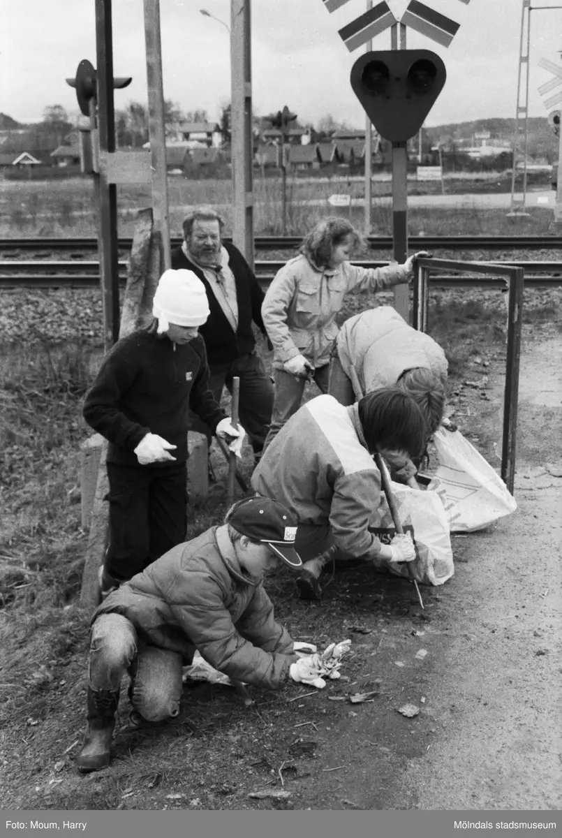 Annestorpsdalens scoutkår städar i Lindome centrum med angränsande områden, år 1985.