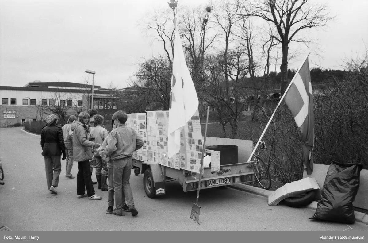 Annestorpsdalens scoutkår städar i Lindome centrum med angränsande områden, år 1985.