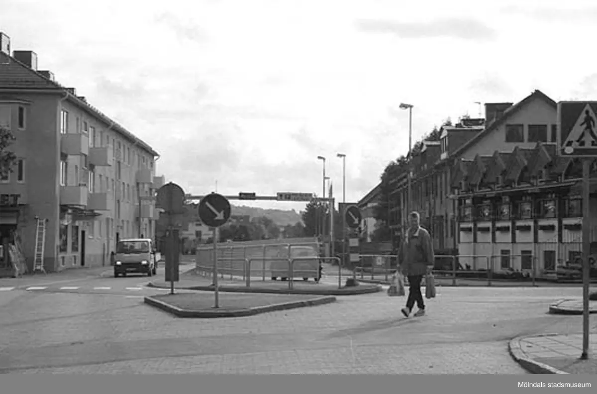 Storgatan med Sahlins terrass till höger år 1996. Mölndalsbro i dag - ett skolpedagogiskt dokumentationsprojekt på Mölndals museum under oktober 1996. 1996_0913-0930 gjorda av högstadieelever från Kvarnbyskolan 9A, grupp 1. Se även gruppbilder på klasserna 1996_1382-1405 och bilder från den färdiga utställningen 1996_1358-1381.