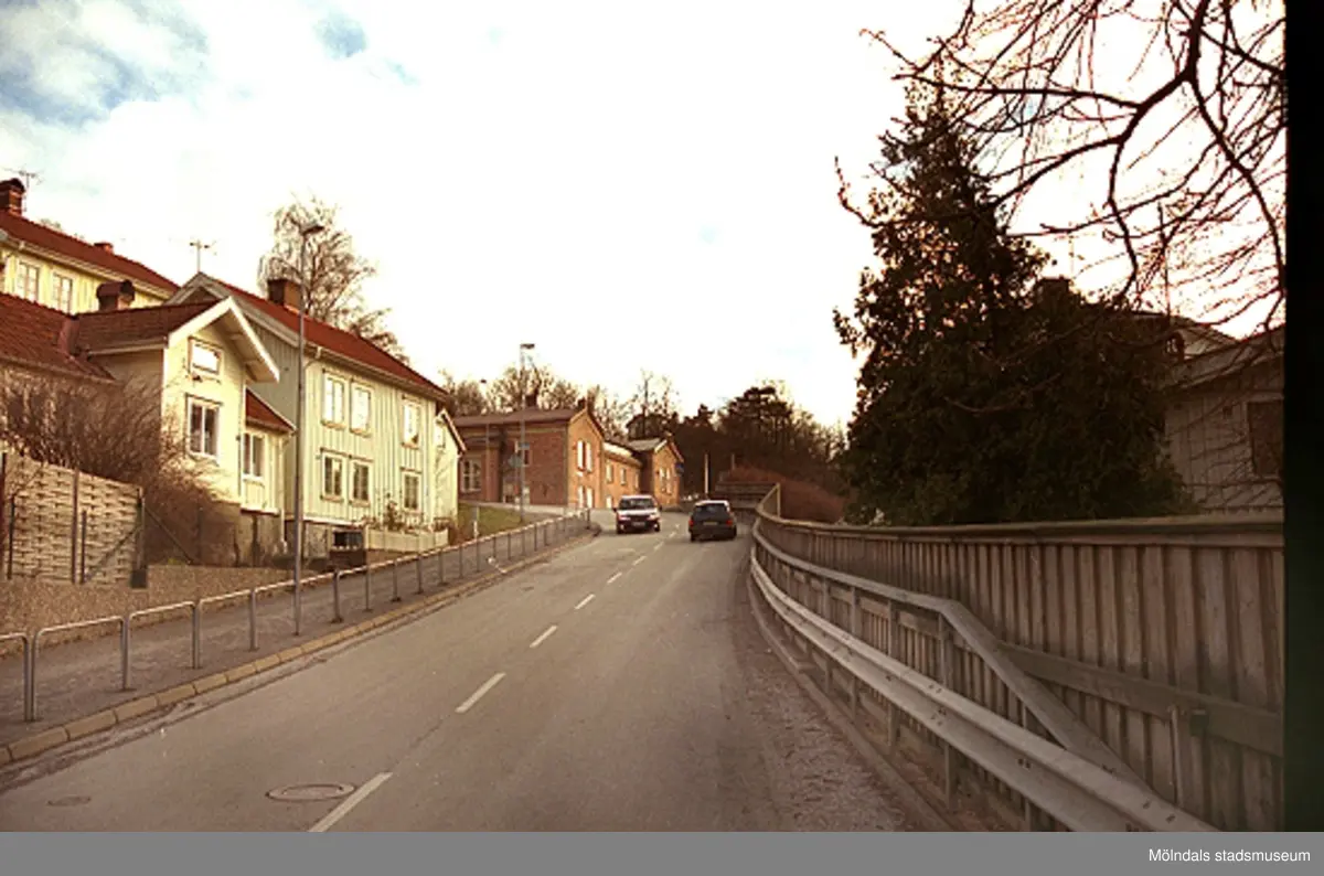 Längst upp i backen skymtar gamla sjukstugan, f.d polishuset och där Mölndals museum tidigare låg (1986-2002), Norra Forsåkersgatan 19 år 2001. Till vänster ses "Pannemans". Huset byggdes av en tysk man som drev ett sockerbruk. Efter detta ligger "Kiste-Pers". Här bodde en man som kallades Kiste-Per. Han byggde likkistor åt Korndals fabriker. När en arbetare avled fick familjen en kista av fabriken. På höger sida ses Papyrusområdets fastighet.