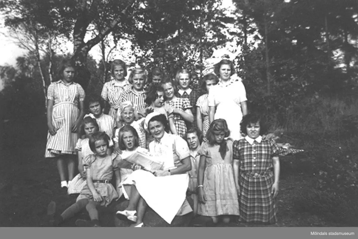 Vårdarinnan Karin Hasselberg med unga kvinnliga elever vid Skolhemmet Stretered den 27 september 1953.