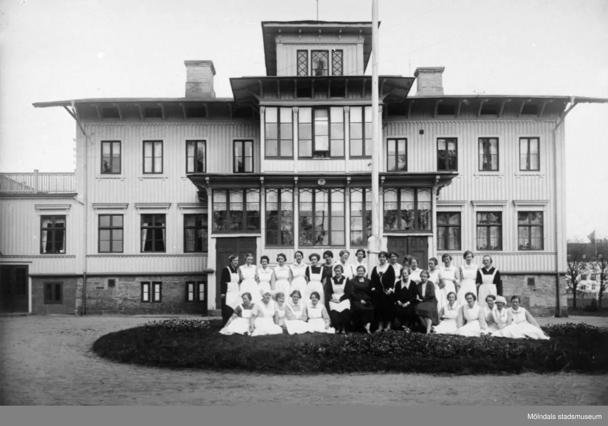 Lärarinnor och vårdarinnor utanför byggnaden "Försöket" på Stretered skolhem.