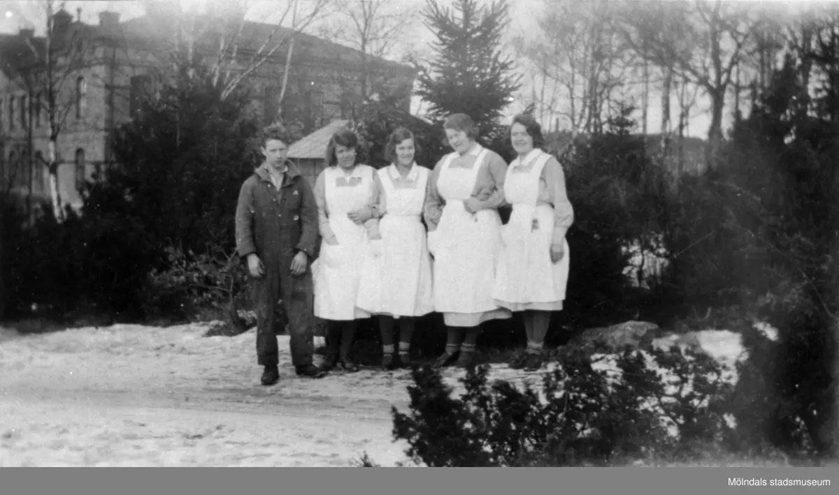 De står med huvudbyggnaden i bakgrunden. Det är jultid med huggna julgranar, som väntar på att placeras ut i de olika avdelningarna. Det skulle kunna vara en ung Johan Karlsson som står bredvid damerna. Platsen är vägen upp mot rättarstugan. Eftermiddagssolen står lågt.