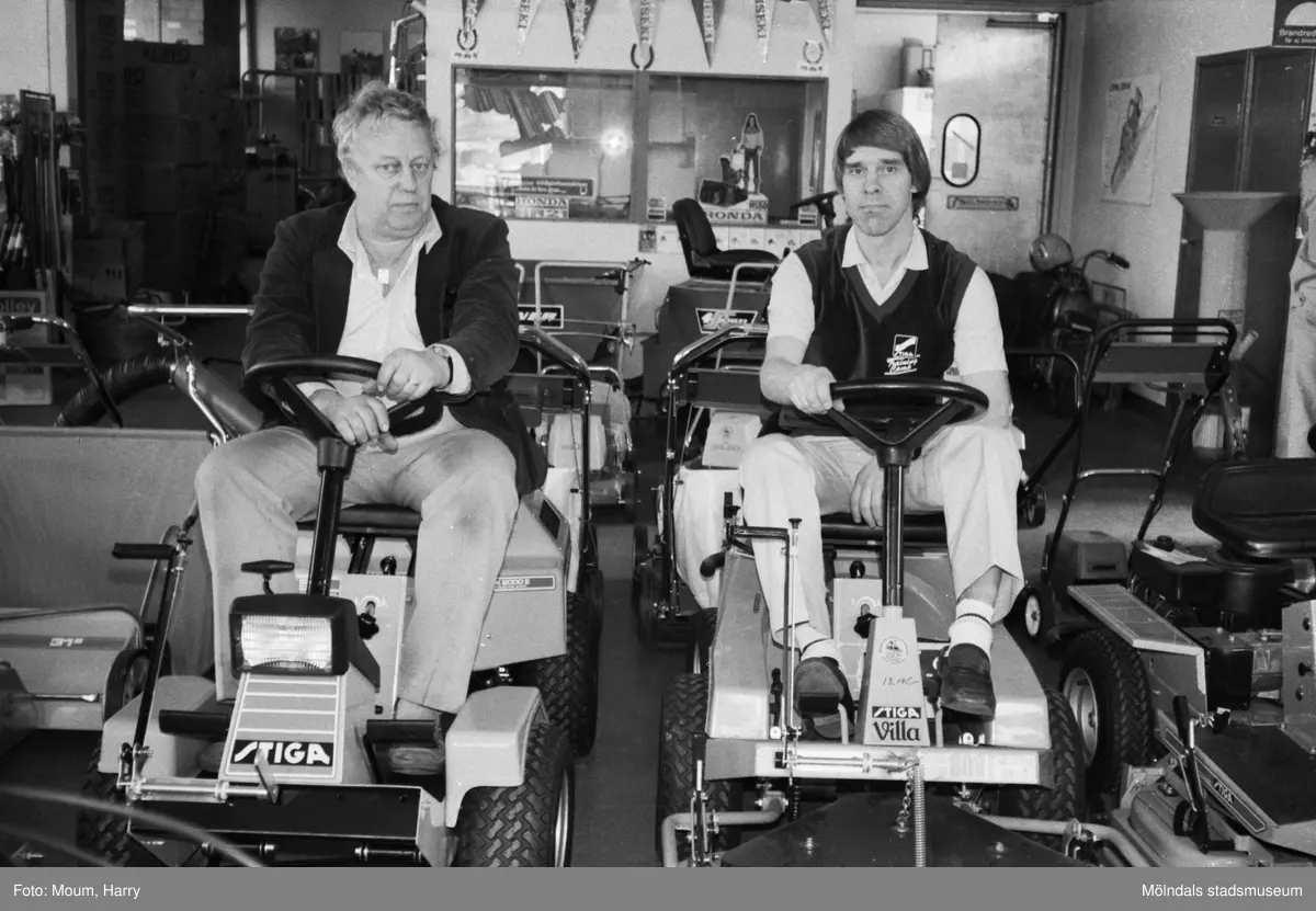 Företaget Agria Trädgårdsmaskiner AB 20-årsjubilerar i Kållered, år 1983. "I 20 år har Bertil Andersson drivit Agria och är en välkänd profil i Kållered. Här tillsammans med en representant."