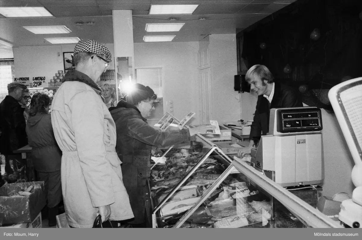 Ny fiskaffär, Fiskhörnan, på Hagabäcksleden i Kållereds centrum, år 1983. "Christer Augustsson betjänar kunder i sin nyöppnade affär."