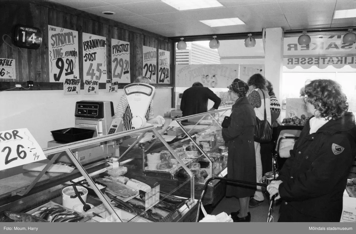 Ny fiskaffär, Fiskhörnan, på Hagabäcksleden i Kållereds centrum, år 1983. Christer Augustsson och Christina Sjöbring betjänar kunder.
