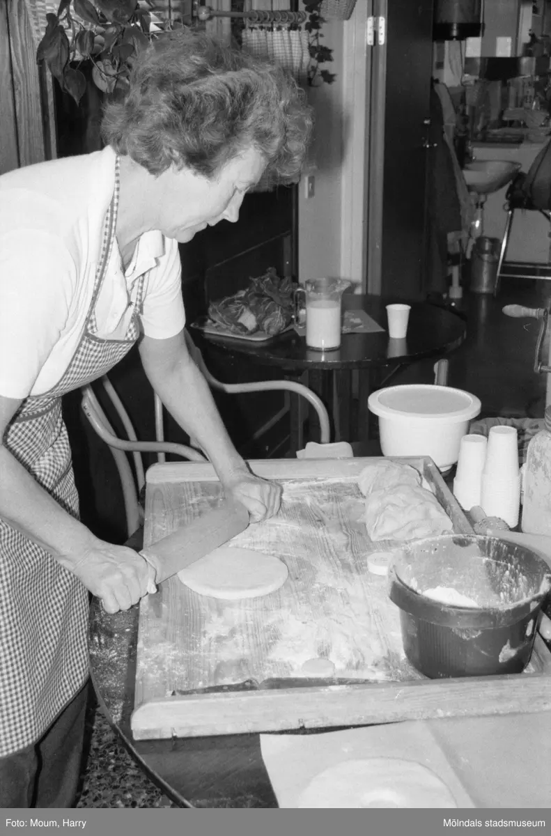 Familjesöndag med diverse aktiviteter på Almåsgården i Lindome, år 1984. En kvinna bakar.