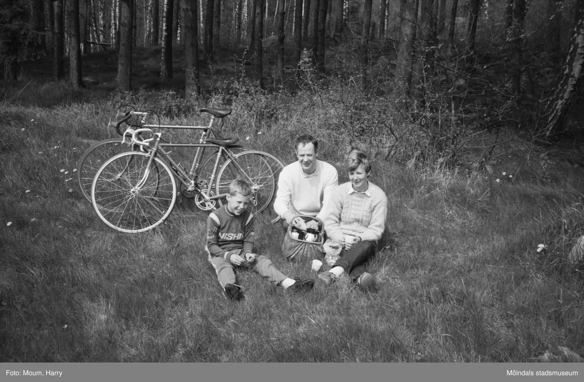 Mölndals Cykelklubb anordnar motionsloppet Lindome-rundan i Lindome, år 1983. "Familjen Birkestad passade på att koppla av i skogsbacken under rundan."