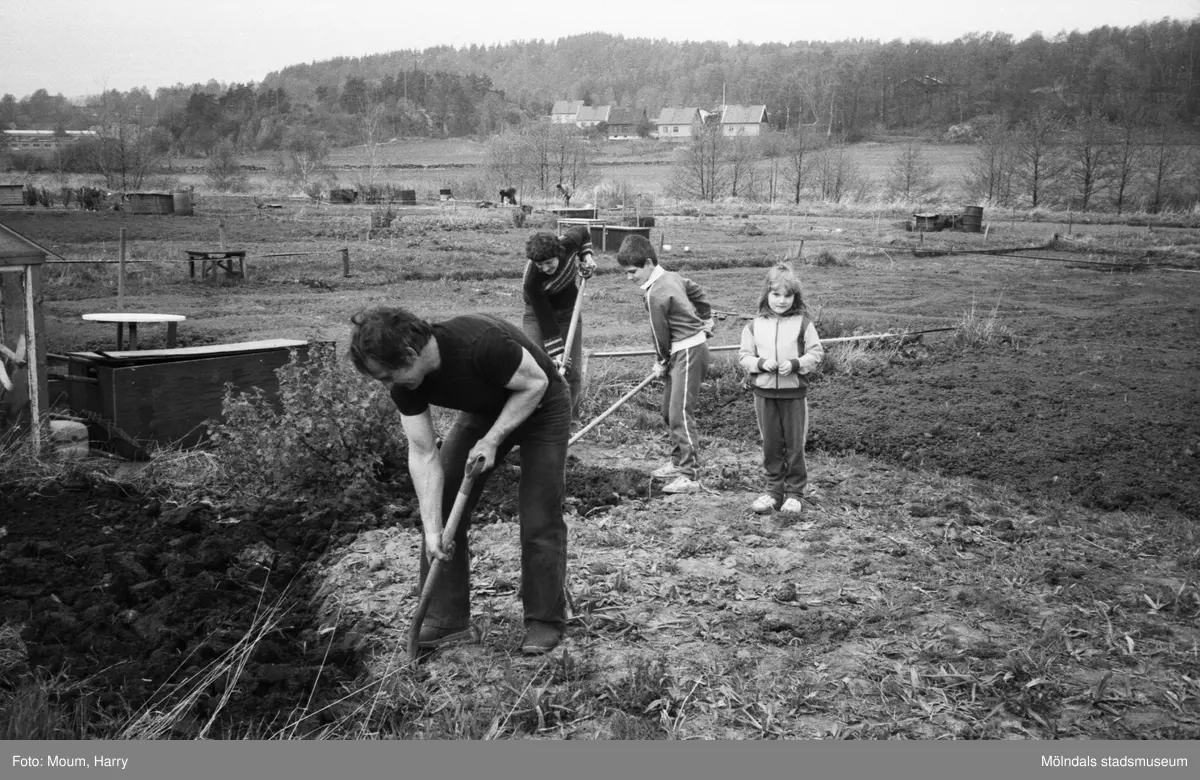 Vårbruk i Lindome, år 1983. "Familjen Salin påtar i jorden på sin odlingslott."