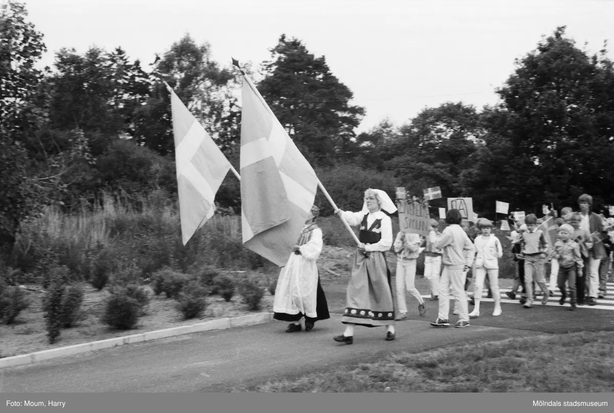 Nationaldagsfirande i Kållered, år 1984. "Brattås och Livereds skolor på väg mot Ekenskolan tillsammans med daghems- och lekskolebarn."