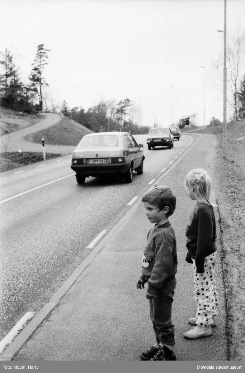 Farlig väg i Kållered, år 1985. "Det är den här vägen som de 31 familjerna i Kållered anser vara en trafikfara och därför kräver åtgärder."