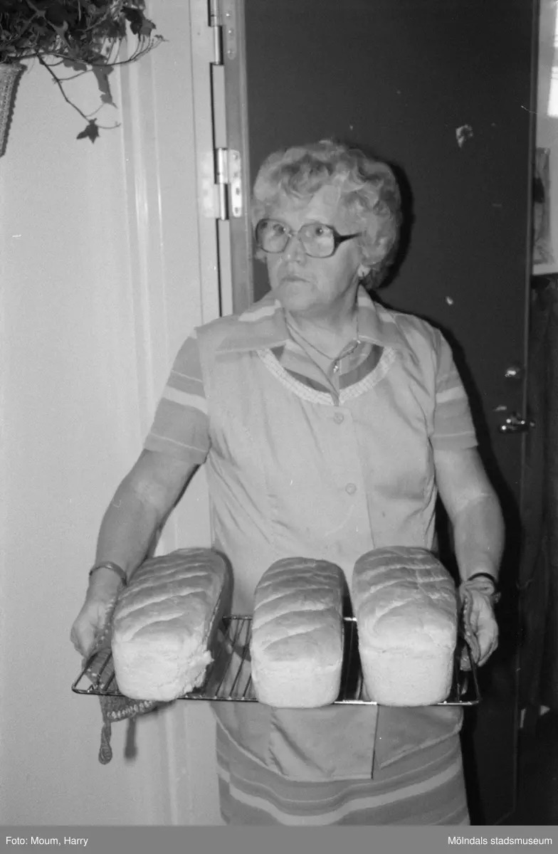 Familjesöndag med diverse aktiviteter på Almåsgården i Lindome, år 1984. En kvinna med nybakade bröd.
