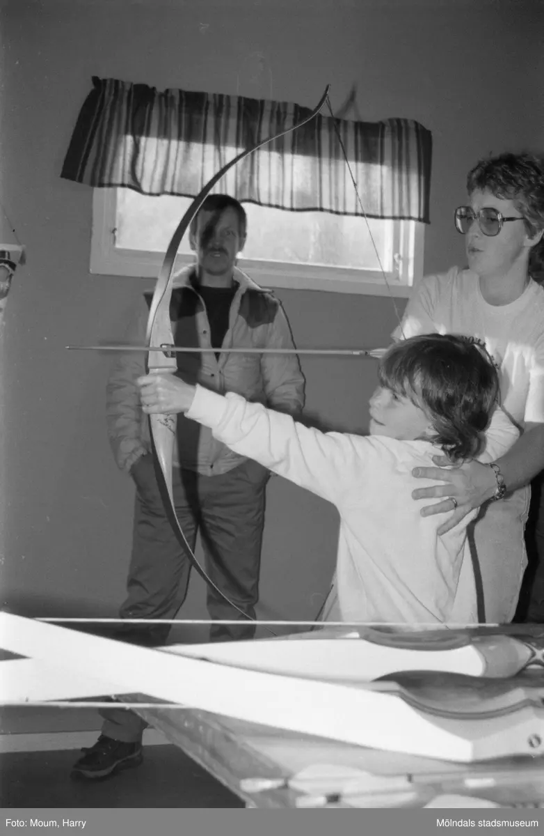 Lindome bågskytteklubb anordnar poängpromenaden "Gåsajakten" i Lindome, år 1984. "Linda Sallylä, 7 år prövar att skjuta med båge och pil."
