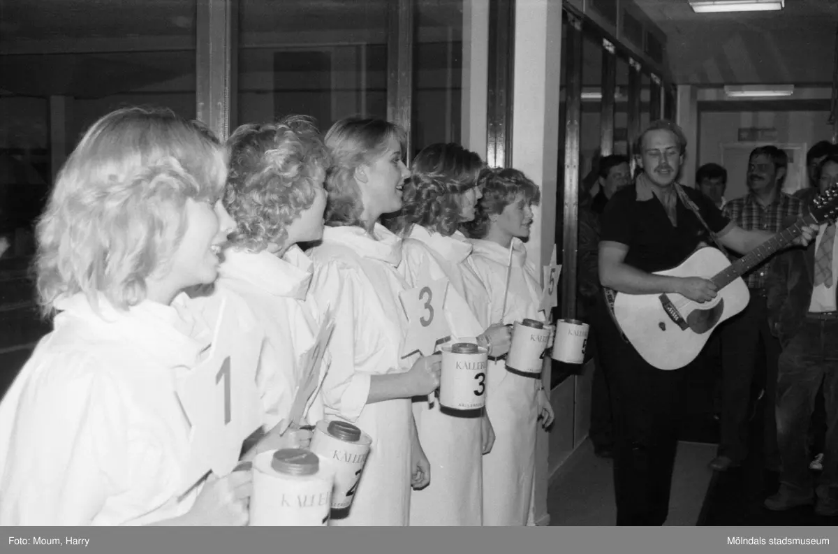 Titel: Kållereds lucia-kandidater samlar in pengar på Kållereds bowlinghall, år 1984. För mer information om bilden se under tilläggsinformation.