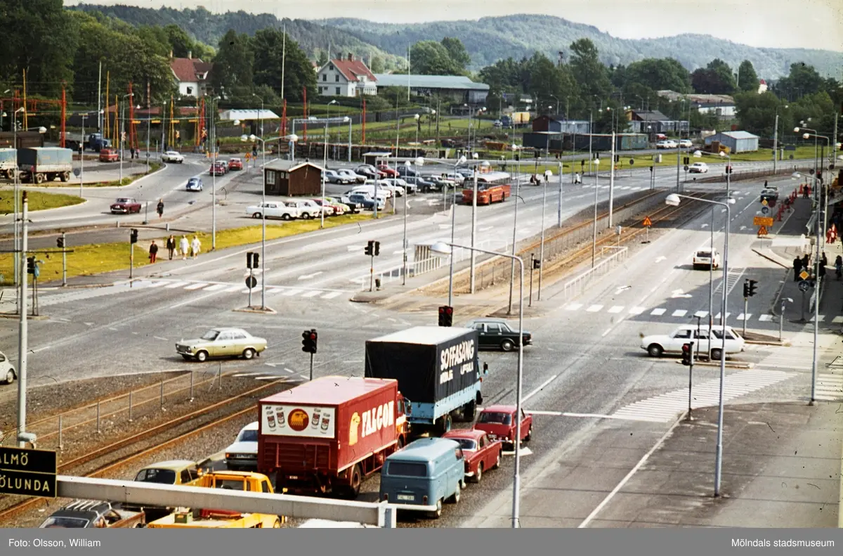 Vy åt söder över Mölndals centrum, okänt årtal. Till höger ser man en bil köra från Tempelgatan ut på Göteborgsvägen. Längre bort ser man dåvarande järnvägsövergången mellan centrum och Kvarnbygatan (senare Mölndals bro) samt Forsåker.