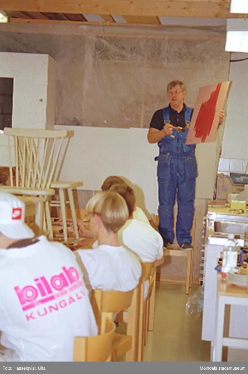 Pedagogisk verksamhet i samband med tillfällig utställning "Lindomemöbler". Bildhuggeri och ådermålning (Almåsskolan klass 8). Alf Garthman visar målning. Se även 1994_0998-1994_1034 samt 1994_1046-1994_1061.
