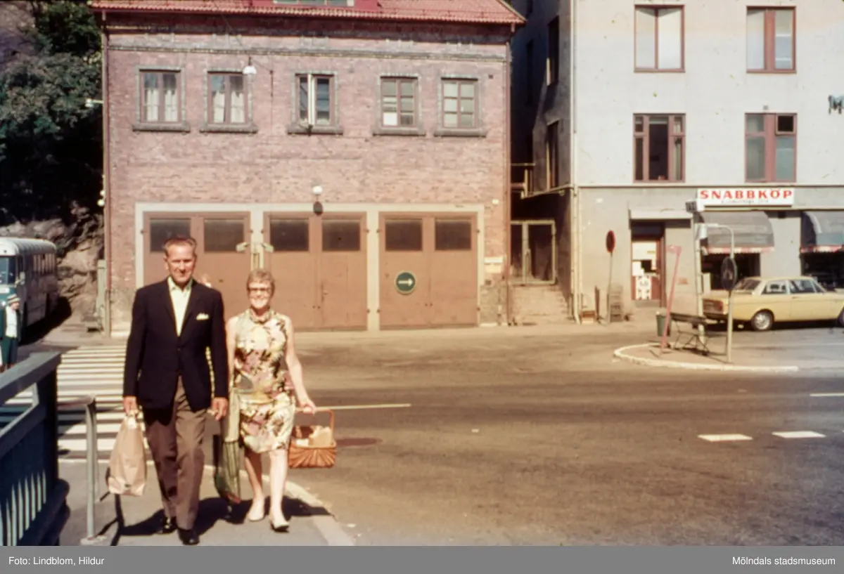 En kvinna och en man vid Gamla Torget i Mölndal, 1970-tal. I bakgrunden ses huset Kvarnbygatan 41, tidigare brandstation och garage för polisbilar, numera Mölndals målarskola. Till höger ses liten del av huset Kvarnbygatan 43, tidigare Mölndals stadshus, sedermera musikskola. Vy från Forsebron.