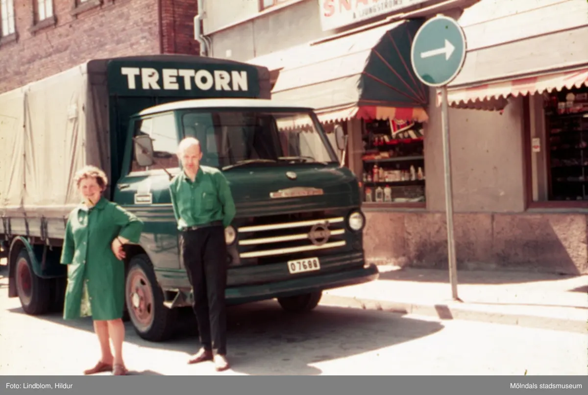 Leverans till Rasmussons skoaffär. En kvinna och en man står framför en lastbil på Gamla Torget i Mölndal, 1970-tal. På lastbilen står namnet Tretorn. Byggnaderna i bakgrunden är till vänster Kvarnbygatan 41, tidigare brandstation och garage för polisbilar, numera Mölndals målarskola. Till höger Kvarnbygatan 43, tidigare Mölndals stadshus, sedermera musikskola. Skoaffären låg mittemot dessa byggnader.