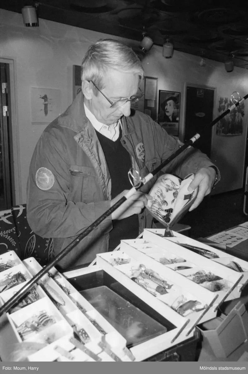 Familjesöndag med diverse aktiviteter på Almåsgården i Lindome, år 1984. Man med fiskeutrustning.