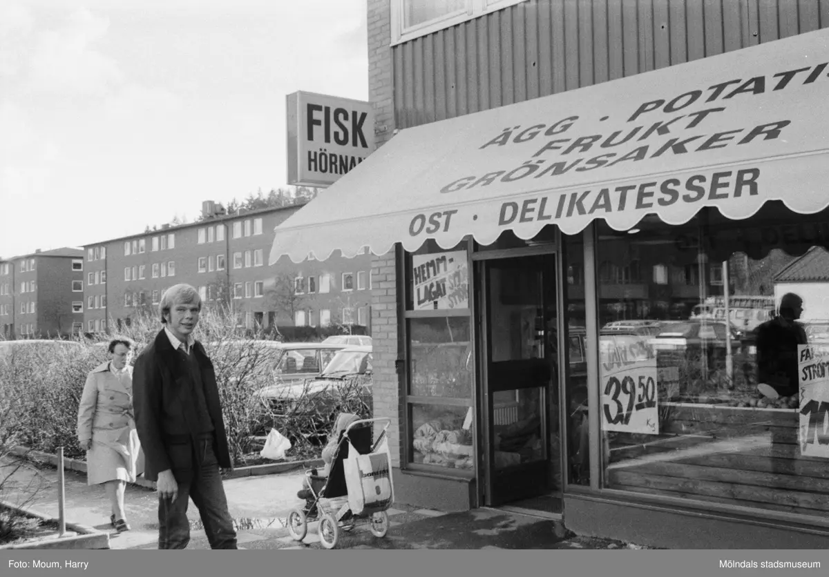 Ny fiskaffär, Fiskhörnan, på Hagabäcksleden i Kållereds centrum, år 1983. Christer Augustsson utanför affären.