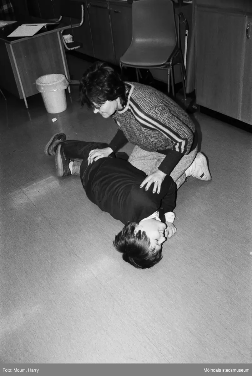 Titel: Kållereds Röda Kors arrangerar livräddningskurs i Hallenskolan, Kållered, år 1984. För mer information om bilden se under tilläggsinformation.