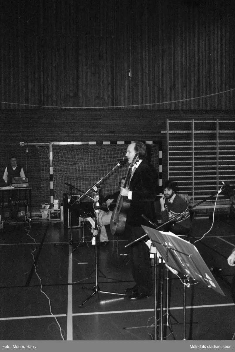 Titel: Trubaduren och viskompositören Alf Hambe håller tillsammans med gruppen Vindharpan konsert i Ekenskolans gymnastiksal i Kållered, år 1983. För mer information om bilden se under tilläggsinformation.