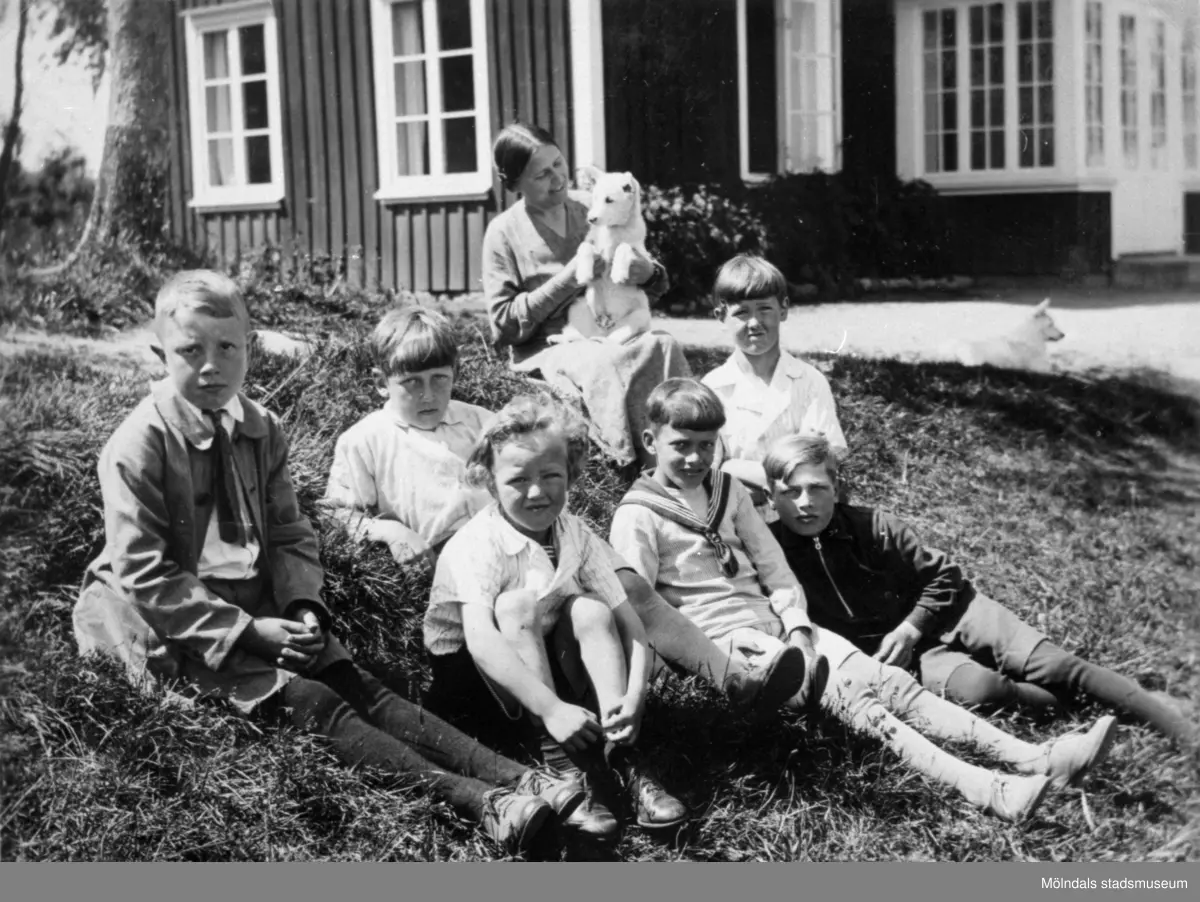 Valdeborg Johansson med hund i famnen tillsammans med sina elever utanför skolan, våren 1934. Text på fotots baksida: "Småfolk". Samma elever som på bild 1992_0007, 0008.