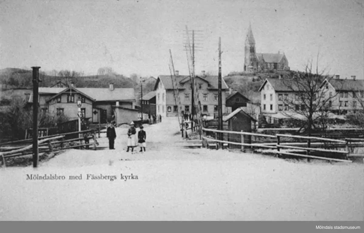 Avfotograferat vykort "Mölndalsbro med Fässbergs kyrka", okänt årtal. Järnvägsövergången vid Mölndalsbro med Kungsbackavägen 1, okänt årtal. Göteborgsvägen 1, 3 och 5 ses i bakgrunden.