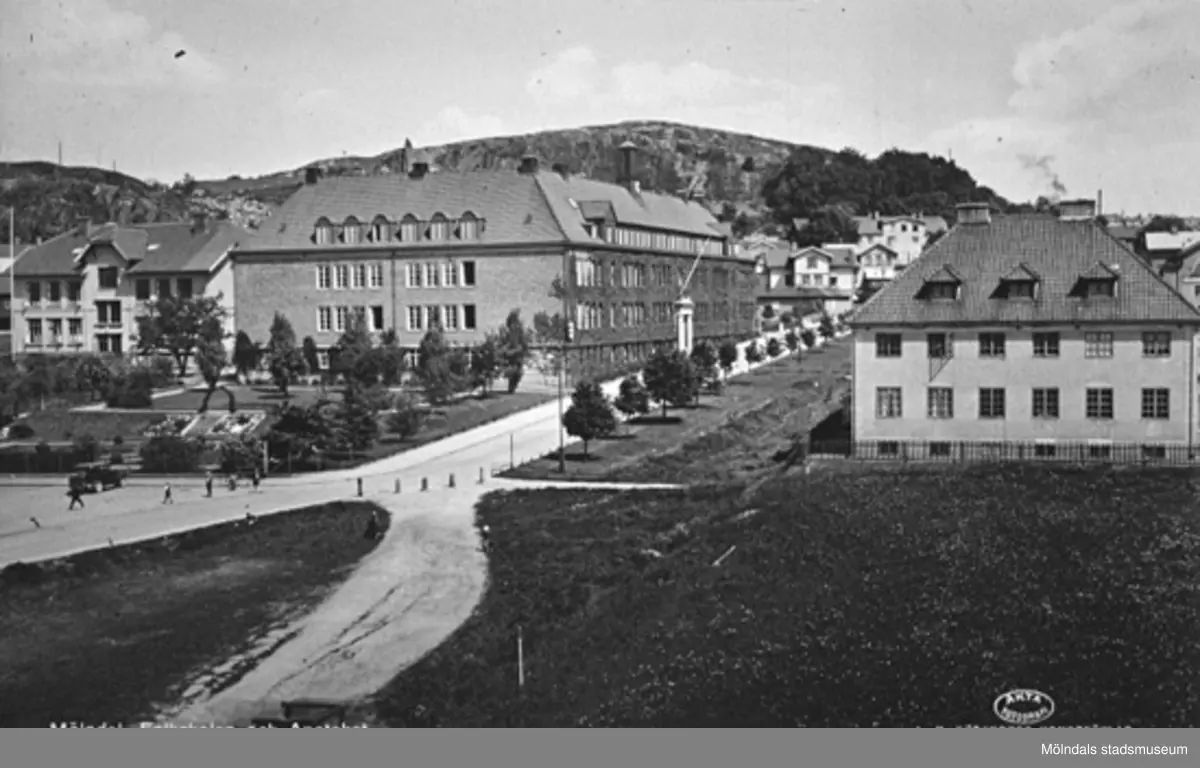 Avfotograferat vykort "Mölndal. Folkskolan och Apoteket.", okänt årtal. Till vänster ses Kvarnbyskolan ( i Allén) och till höger Apoteket på Kvarnbygatan 9.