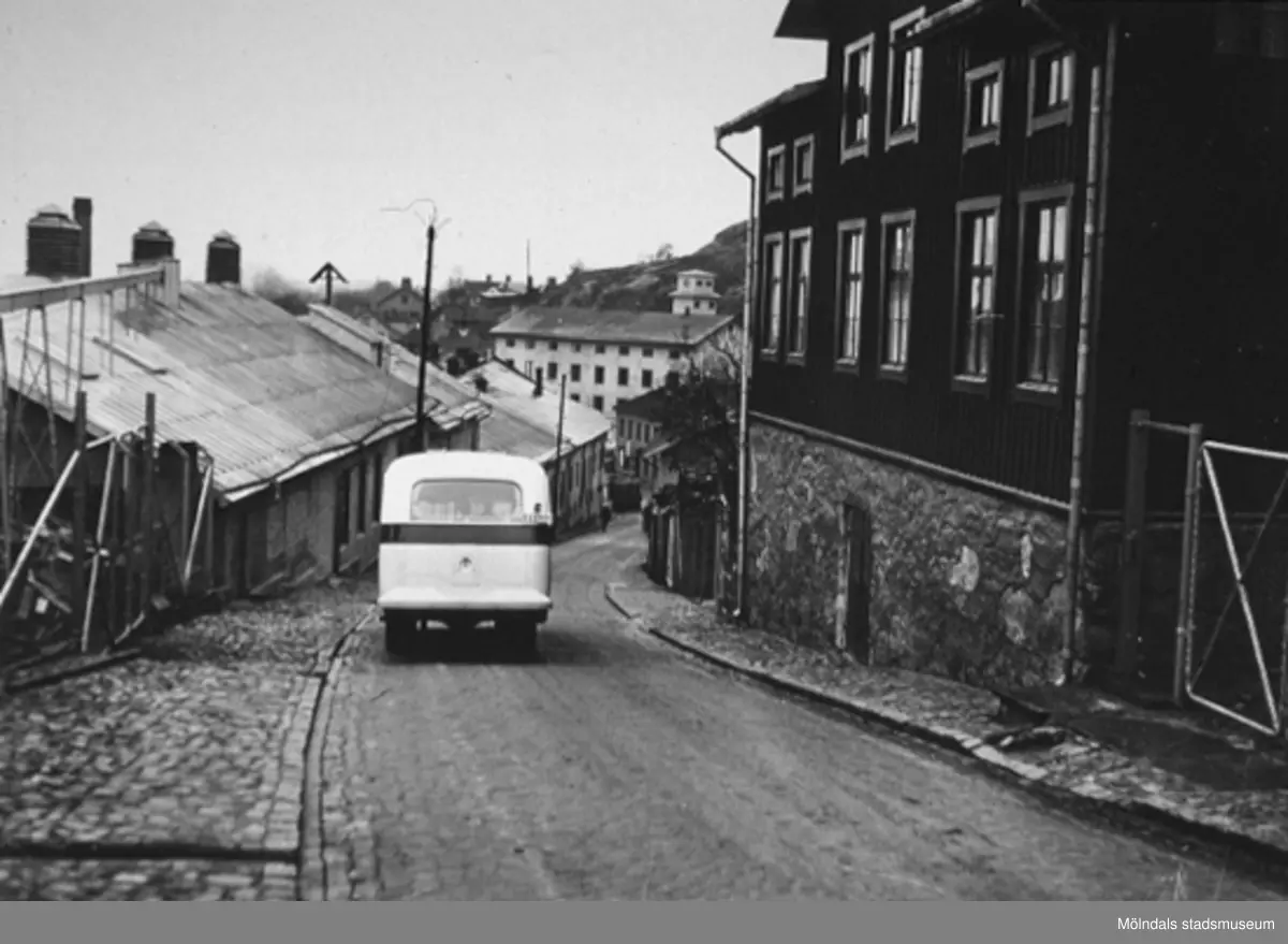 En av de första bussarna kör nedför "Kråkan" (Kvarnbygatan) år 1936. Busstrafik i denna mycket branta backe var en stor sensation och fotograferades därför.