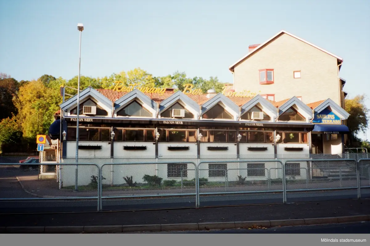 Sahlins terrass på Storgatan. Mölndalsbro i dag - ett skolpedagogiskt dokumentationsprojekt på Mölndals museum under oktober 1996. 1996_1061-1076 är gjorda av högstadieelever från Kvarnbyskolan 9C, grupp 3. Se även 1996_0913-0940, gruppbilder på klasserna 1996_1382-1405 samt bilder från den färdiga utställningen 1996_1358-1381.