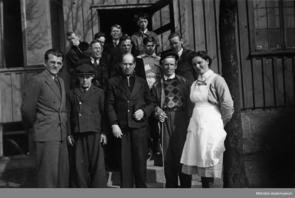 Utanför arbetshemmet på skol- och vårdhemmet Stretered i Kållered. Ivar Andersson, Bosse, Lasse Claesson, Martin Johansson, Gösta Johansson, Lennart Hast, Viktor Andersson, Arvid Söderqvist, småländska sköterskan, Axel Ahlgren. Lennart Hast körde posten.