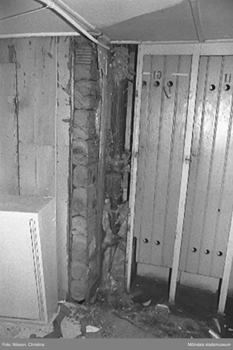 Kvarnfallet 31 i Grevedämmet, hösten 1994. Interiör i fabriksbyggnad. Byggnadsdetaljer: Ledning i taket och inbyggt skåp. Relaterade motiv: 2001_0662 - 0757.