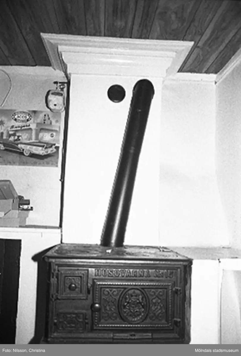 Kvarnfallet 31 i Grevedämmet, hösten 1994. Interiör från vindsvåningen i Röda huset, G-3. Bilden visar en Husqvarna järnspis nr 15 i rummet vid västra gaveln. Spisen var vid tillfället obrukbar.