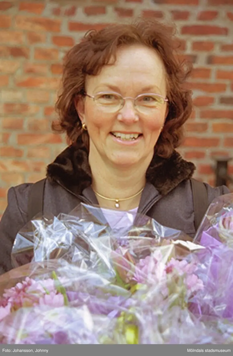 Kvarnbydagen 28 april 2002. Kultursekreterare Gudrun Piculell står beredd att dela ut blommor till dansarna av ForsAnde. I bakgrunden ses Stora Götafors.