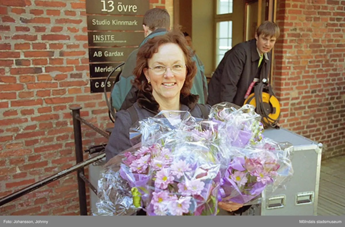 Kvarnbydagen 28 april 2002. Kultursekreterare Gudrun Piculell står beredd att dela ut blommor till dansarna av ForsAnde. I bakgrunden ses Stora Götafors.