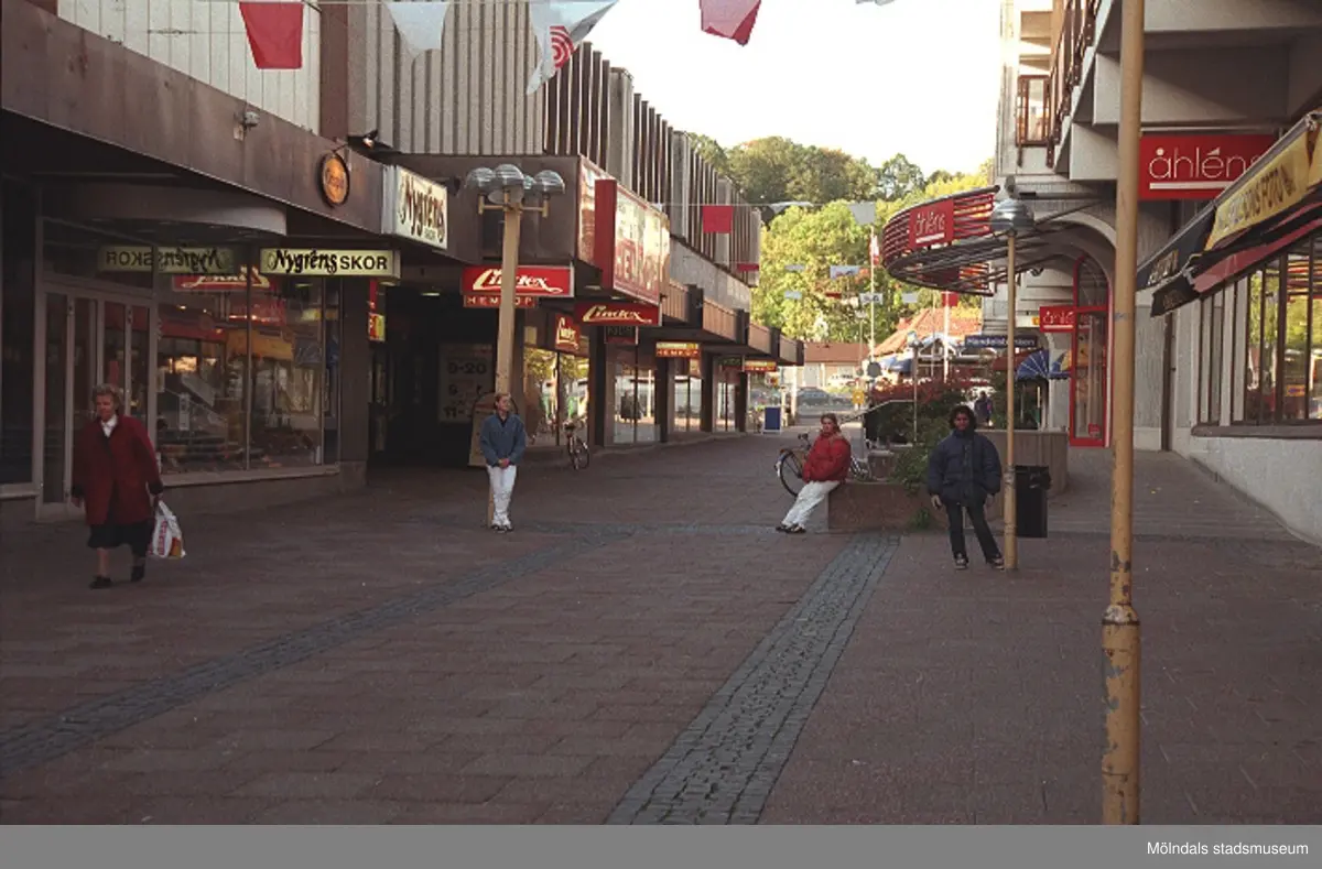 Brogatan västerut. Mölndalsbro i dag - ett skolpedagogiskt dokumentationsprojekt på Mölndals museum under oktober 1996. 1996_0991-1004 är gjorda av högstadieelever från Kvarnbyskolan 9A, grupp 5. Se även 1996_0913-0940, gruppbilder på klasserna 1996_1382-1405 samt bilder från den färdiga utställningen 1996_1358-1381.