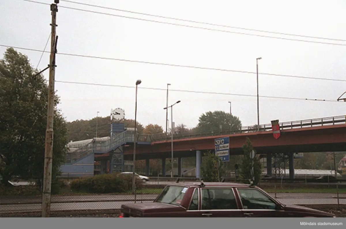 Mölndals station och bron. Mölndalsbro i dag - ett skolpedagogiskt dokumentationsprojekt på Mölndals museum under oktober 1996. 1996_1135-1152 är gjorda av högstadieelever från Kvarnbyskolan 9D, grupp 1. Se även 1996_0913-0940, gruppbilder på klasserna 1996_1382-1405 samt bilder från den färdiga utställningen 1996_1358-1381.