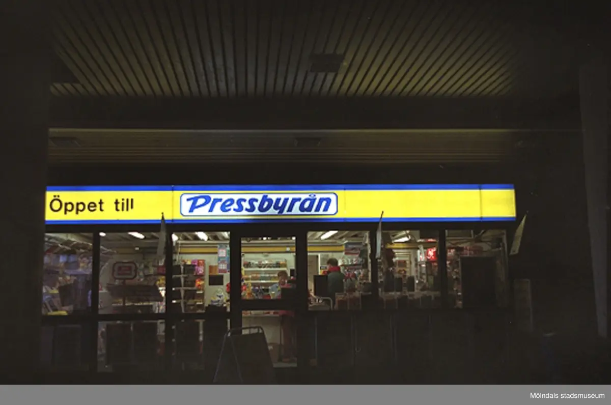 Pressbyrån under bron. Mölndalsbro i dag - ett skolpedagogiskt dokumentationsprojekt på Mölndals museum under oktober 1996. 1996_1153-1171 är gjorda av högstadieelever från Kvarnbyskolan 9D, grupp 2. Se även 1996_0913-0940.