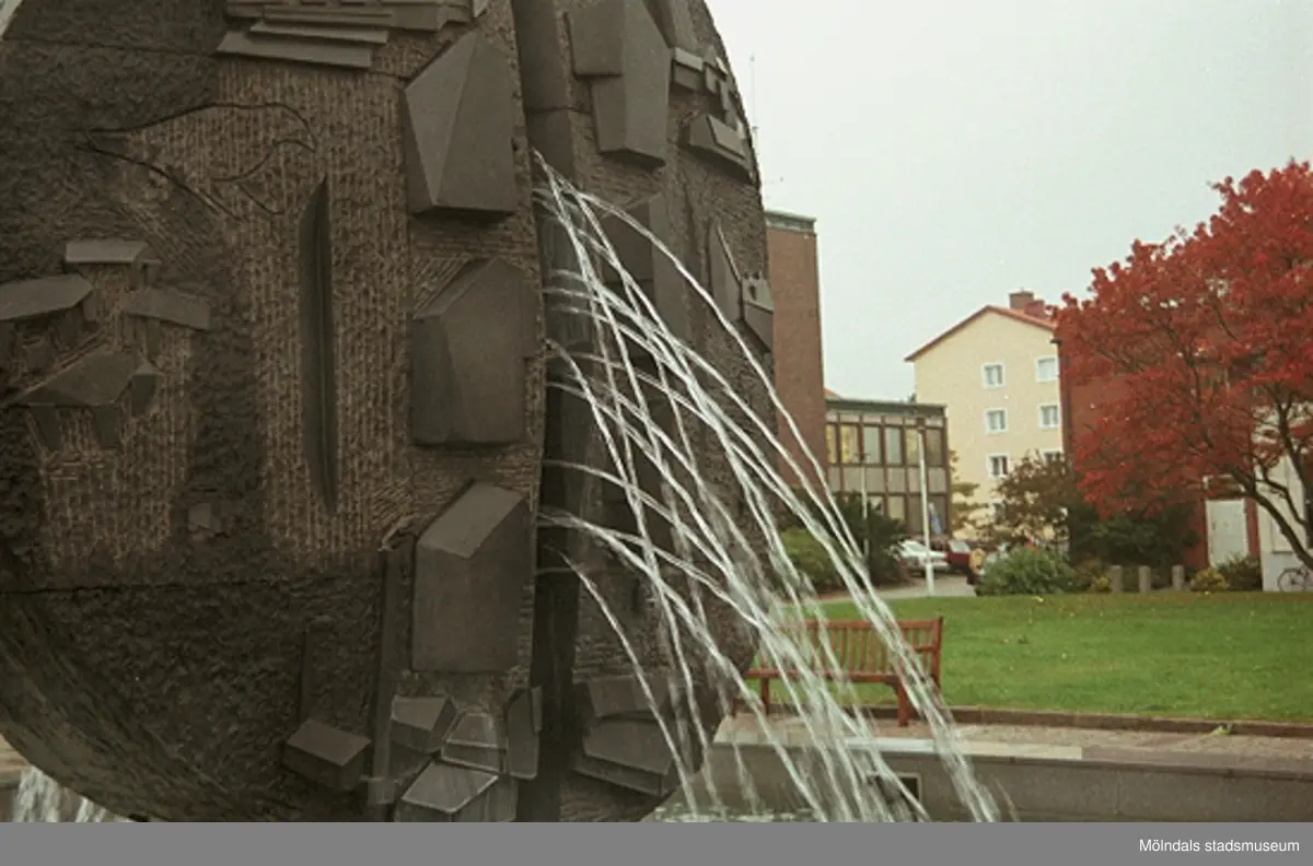Skulpturen Faesberghia på Stadshusplatsen. I bakgrunden skymtas stadshuset samt fastigheter på Knarrhögsgatan. Mölndalsbro i dag - ett skolpedagogiskt dokumentationsprojekt på Mölndals museum under oktober 1996. 1996_1190-1211 är gjorda av högstadieelever från Kvarnbyskolan 9D, grupp 4. Se även 1996_0913-0940.