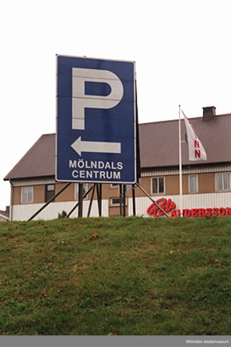 Parkeringsskylt. Anderssons Päls (Storgatan 40) ses i bakgrunden. Mölndalsbro i dag - ett skolpedagogiskt dokumentationsprojekt på Mölndals museum under oktober 1996. 1996_1135-1152 är gjorda av högstadieelever från Kvarnbyskolan 9D, grupp 1. Se även 1996_0913-0940, gruppbilder på klasserna 1996_1382-1405 samt bilder från den färdiga utställningen 1996_1358-1381.