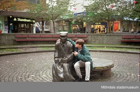 En kille sitter vid en skulptur på Alberts torg. Mölndalsbro i dag - ett skolpedagogiskt dokumentationsprojekt på Mölndals museum under oktober 1996. 1996_1227-1245 är gjorda av högstadieelever från Kvarnbyskolan 9D, grupp 6. Se även 1996_0913-0940.