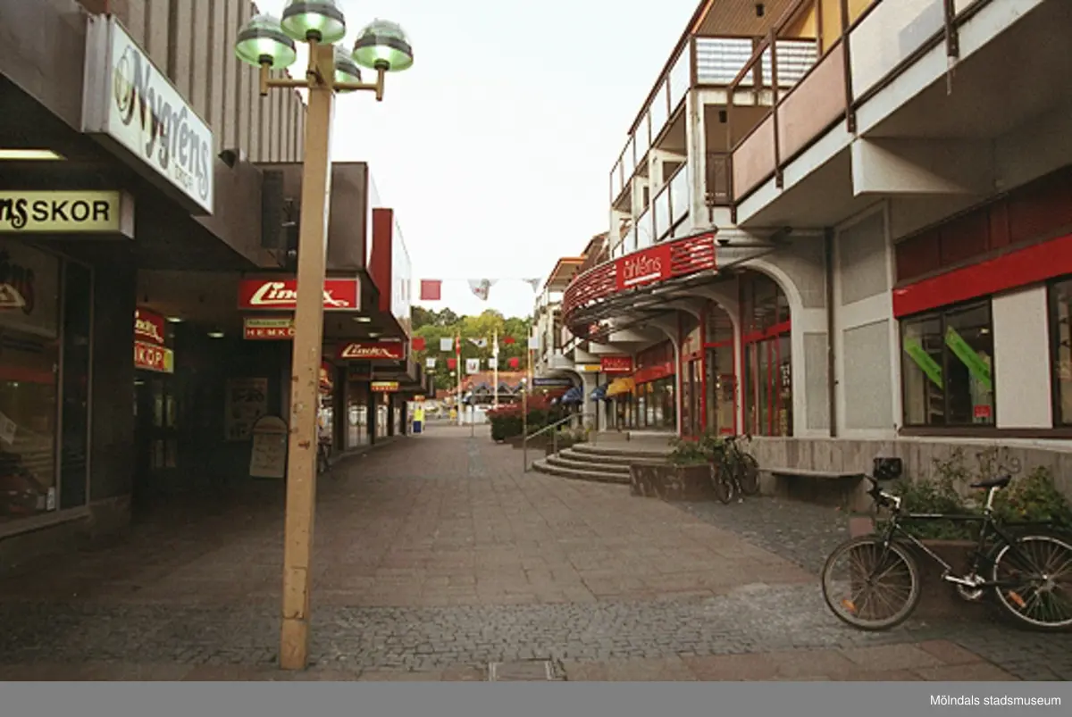 Brogatan västerut. I fonden skymtas Sahlins terrass. Mölndalsbro i dag - ett skolpedagogiskt dokumentationsprojekt på Mölndals museum under oktober 1996. 1996_1264-1282 är gjorda av högstadieelever från Åbyskolan 8A, grupp 2. Se även 1996_0913-0940, gruppbilder på klasserna 1996_1382-1405 och bilder från den färdiga utställningen 1996_1358-1381.