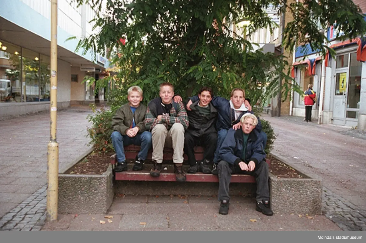 Fem ungdomar som sitter på en parkbänk. Mölndalsbro i dag - ett skolpedagogiskt dokumentationsprojekt på Mölndals museum under oktober 1996. 1996_1246-1263 är gjorda av högstadieelever från Åbyskolan 8A, grupp 1. Se även 1996_0913-0940, gruppbilder på klasserna 1996_1382-1405 och bilder från den färdiga utställningen 1996_1358-1381.