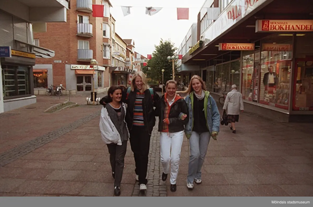 Titel: Fyra tjejer promenerar västerut på Brogatan. Mölndalsbro i dag - ett skolpedagogiskt dokumentationsprojekt på Mölndals museum under oktober 1996. 1996_1264-1282 är gjorda av högstadieelever från Åbyskolan 8A, grupp 2. Se även 1996_0913-0940, gruppbilder på klasserna 1996_1382-1405 och bilder från den färdiga utställningen 1996_1358-1381.