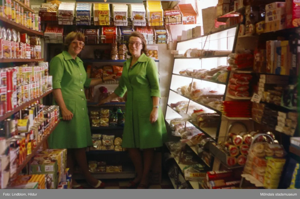 Två kvinnor ur personalen i en livsmedelsaffär. Eventuellt Konsumaffären vid Gamla Torget i Mölndal, 1970-tal.