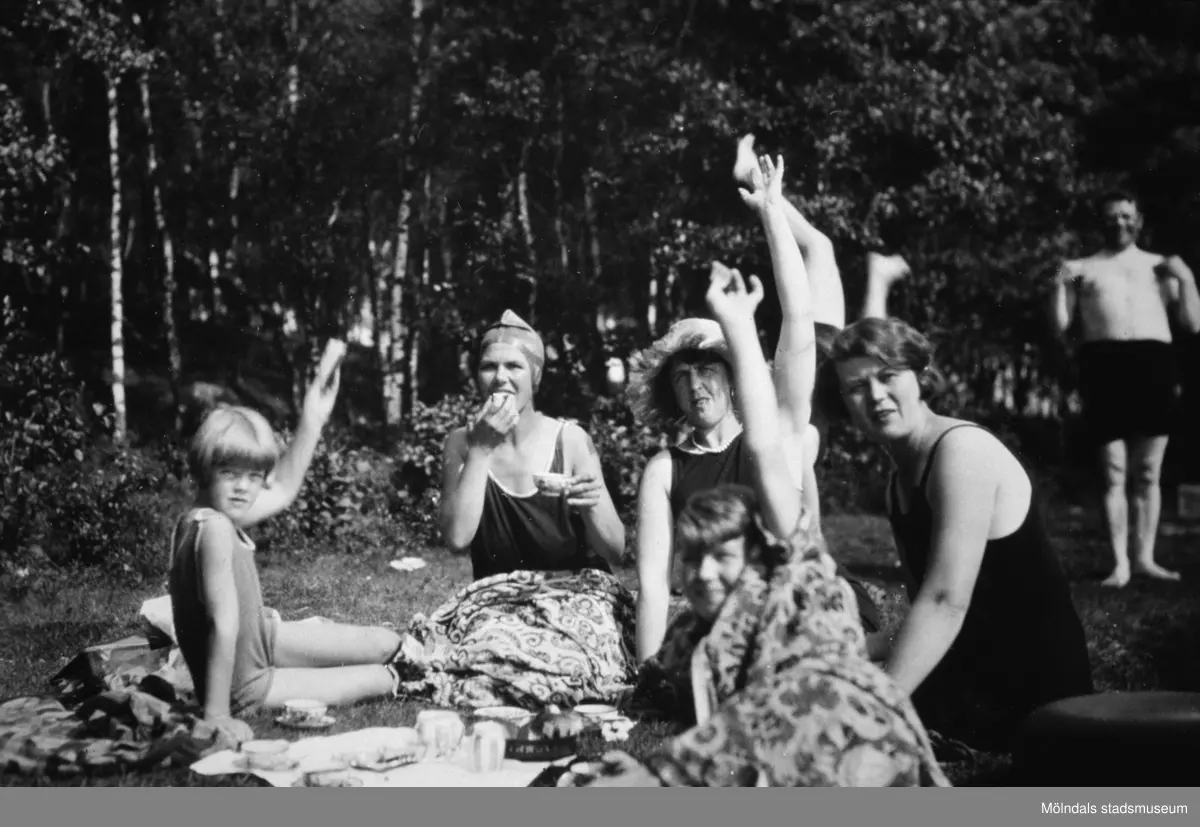 Barn och vuxna fikar på stranden vid Tulebosjön, cirka 1930. Karl Alberts står i bakgrunden till höger.