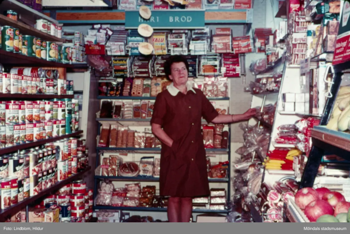 En kvinna ur personalen fotograferad bland hyllorna i Konsumaffären vid Gamla Torget i Mölndal med adress Kvarnbygatan 43, 1970-tal.