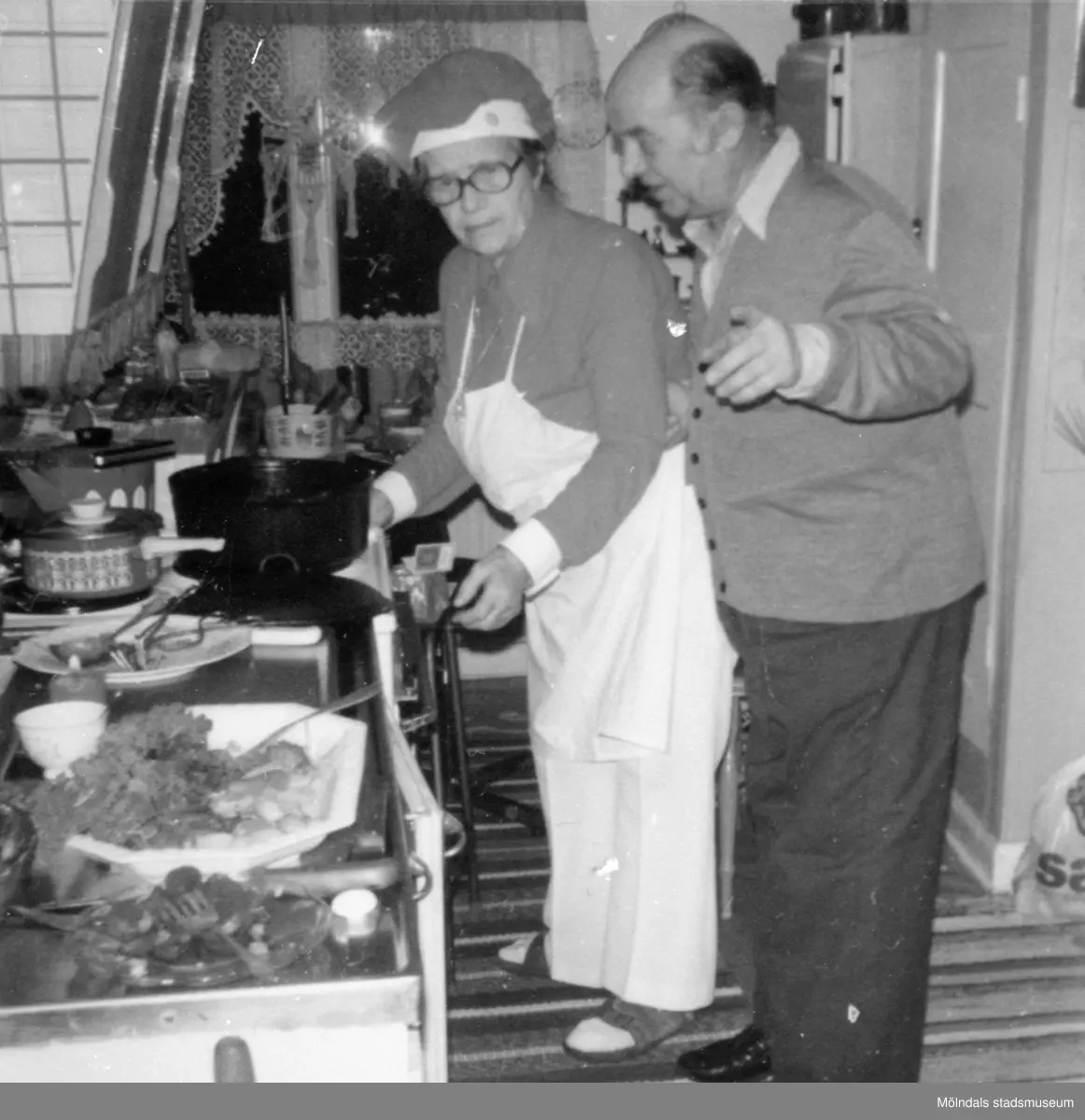 Anna "ve sjön" (Anna Johansson) står i sitt kök på Kikås Långvatten julafton 1977. Bredvid henne står troligtvis hennes kusin. Anna arbetade under 1940-talet som husa på Gunnebo slott.
