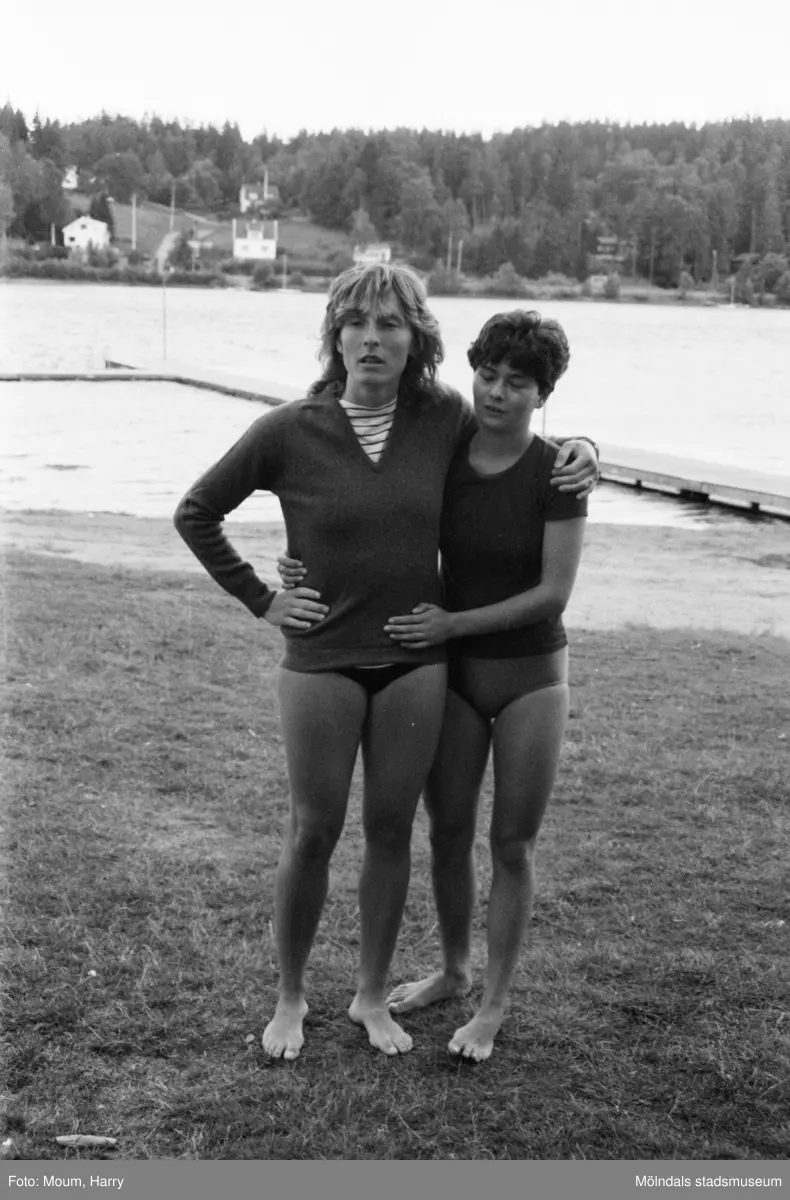 Simskolelärarinnorna Lena Eklund och Angela Iaconelli vid Talluddens badplats, Västra Ingsjön i Lindome, år 1983.